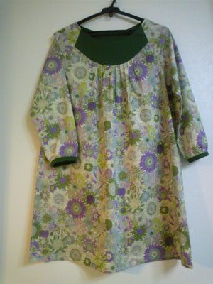 とても印象に残るデザインでしたが、柄が大きかったので購入するのに迷いました。そう若くはない自分自身のために着る服を作りたかったので、”自分が着てお出かけ出来る”ということでチュニック風ブラウスにしてみました。どちらかというと、シャツスタイルが好きで普通はこういったデザインの服は着ないのですがこれなら着てお出かけしたい!!と思えるものになりました。