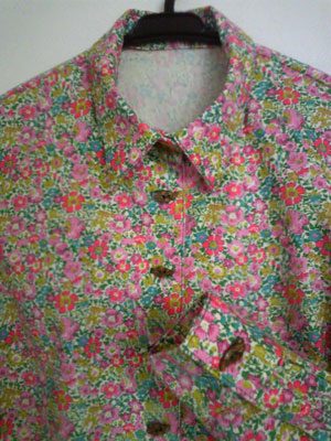冬の服はダークな色合いが多いので、思い切って華やかな色合いを選びました。リバティコーデュロイDora3631254-C11Bで作ったシャツブラウスは、タートルネックなどのニットのうえから羽織るようにして、楽しんでいます。これからの季節は、ジャケットやコートを脱いだら思わずハッとする(だろうな?と期待しつつ)、そんな周囲の反応を楽しみにしています。