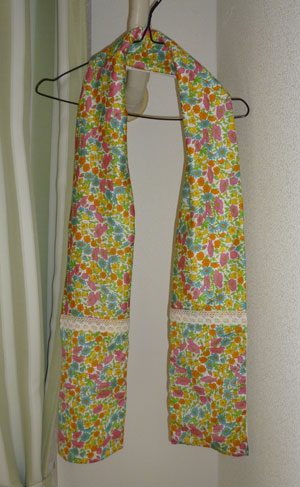 国産定番タナジャージでストールを作りました。半分より2cm多めにPoppy&Daisyの生地を残り半分と裏面は起毛ニット生地です。横にとったので、足らないところはレースでつなげました。下の方は縦地です。暖かいですよぉ。また、いろいろな柄お願いします。