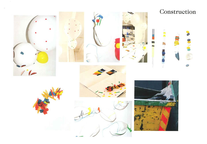 道路工事や建設現場の色使いをヒントにした軽快でテクニカルな色合いのパレットで、産業現場に無造作に散在する色彩を連想させます。そこから生み出されたのは爽やかで、予期していなかったような、不思議と美しい色彩です。風船は明るく軽快な色彩を表現するために使われています。