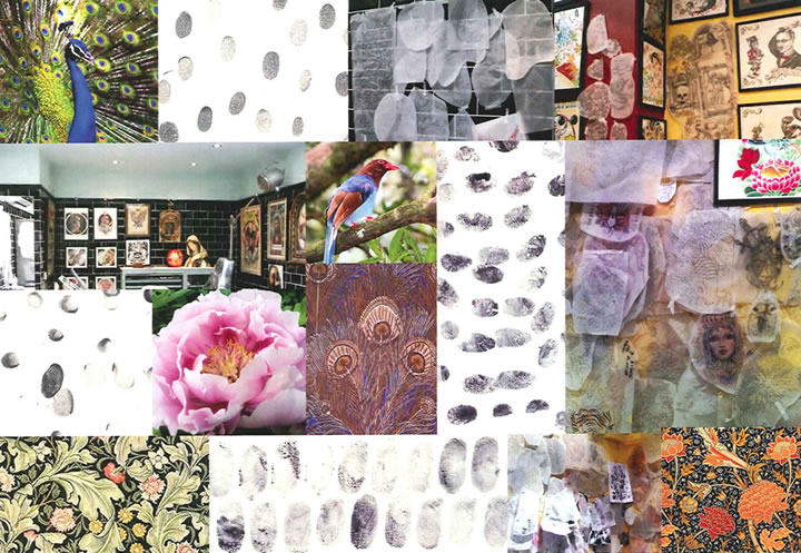 モーは昔から子どもの童話やそこにでてくる邪悪な魔法に魅了されてきたことから、リバティの象徴であるピーコックを色々な種類の鳥で表現しようと考えました。彼は1920年代のリバティ・アーカイヴのプリントからヒントをとり、鳥には真珠の首飾りやアール・デコのブローチを飾り、周囲にはトンボをあしらい、深みのある色地にシュールレアリズム的な柄を生み出しました。