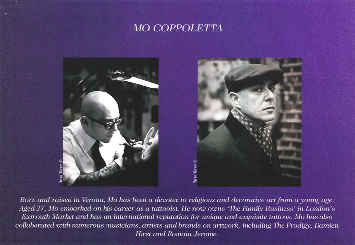「触覚」を代表する人物として、人の身体に触れながら創作を行うアーティスト以上に相応しい人はいません。ヴェローナで生まれ育ったモー・コッポレッタ(Mo Coppoletta)は若い頃から宗教芸術や装飾美術に心酔していました。27歳の時に彼はタトゥー・アーティストとしての道を歩み始め、今ではロンドンのエクスマウス・マーケットで「ザ・ファミリー・ビジネス」を経営しています。ユニークでエキゾチックなタトゥーで世界的名声を博しているばかりでなく、彼は著名な芸術家やブランドのダミアン・ハーストやザ・プロディジーやロメーン・ジェロームとのコラボレーションを通しても有名です。