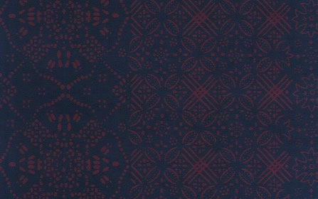 リバティ・アーカイヴに収められている1910年のインディゴ染めのコットンの柄見本からとった柄で、ビュレル・コレクションの刺繍作品と柄の構成が類似していることから選びました。
