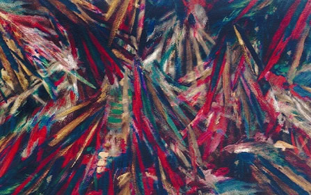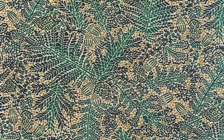 この柄では、熱帯の鳥を複数のキャンバスに自由に描き、その後全体を融合させ、豊かな羽のような質感に仕上げています。