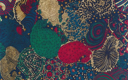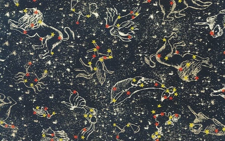 マウント・スチュアートの廊下の巨大なヴォールト天井に描かれた「黄道星座」を象徴する摩訶不思議な存在や、星と星の軌道を題材にした柄です。象徴学の中でも最も古く複雑なのが、星や天体の動きをもとに、それらが星に及ぼす影響を研究する占星学であるとされています。