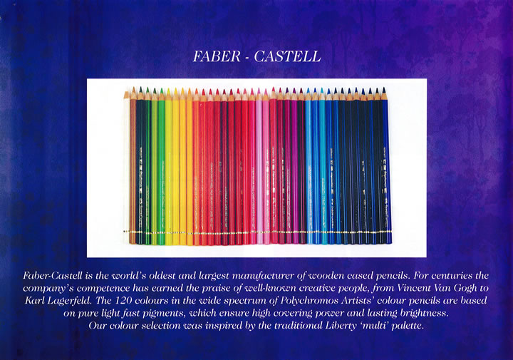 ファーバーカステルは木箱入りの鉛筆を製造する世界で最も古く最大のメーカーです。同社はヴィンセント・ヴァン・ゴッホからカール・ラガーフェルドに至るまで何世紀にもわたり名立たるクリエーターたちの称賛を受けてきました。120色の幅広い色彩が揃った「ポリクロモス油性色鉛筆」には純度の高い耐光性に優れた顔料が使われ、濃く鮮やかな色彩をいつまでも保ちます。カラーには従来のリバティのマルチ・カラー・パレットを念頭に選びました。