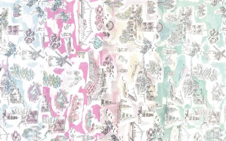 リバティ内で、インクとロットリング製図ペンを使って水墨画風に仕上げた柄で、店内のショップで出会うことのできるヴィンテージスタイルの記念グッズを表現しています。この柄はワイト島で過ごした子どもの頃の思い出をヒントに生まれました。