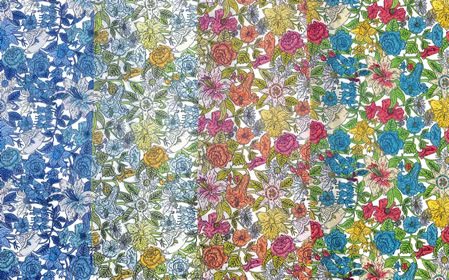 グラファイト鉛筆で描かれたオリジナルのスケッチ画をもとに緻密に描かれた花柄のチンツをいくつも組み合わせリピートをつけアレンジし、ファーバーカステルの色鉛筆で色付けした柄です。この柄はソフトファニシング売り場を表しています。
