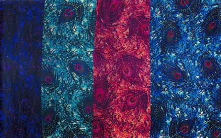 セントラル・セント・マーチンズでファッション・テキスタイルを専攻する2年目の学生が描いた2点のオリジナル作品をもとに制作された柄です。この柄は2012年にセントラル・セント・マーチンズとリバティが共同で出題した「芸術運動」に関する課題のデザイン選考に当たった審査員の一人のアルディーン・ジョンソンによって選ばれました。選考の決め手となったのは、作品のもつアール・デコの退廃的な(デカダンス)美しさに惹かれたことと、ピーコック・フェザーと豊かな色彩がアール・デコ運動の豪華な装飾の世界を彼女に思い起こさせたからでした。スタイリスト兼コンサルタントとしてファッションと音楽の2つの業界で活動しているアルディーンは、2009年からフロレンス・ウェルチのスタイリストも務めています。