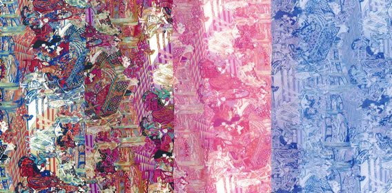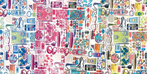アーツ・アンド・クラフツ運動の時代のデザインをヒントに制作したリバティのアーカイブに収められている1980年代のインテリア柄をもとにしたものです。この柄は『ナーズ』の「ナージャー ザン ライフ ロング アイライナー」のバーボン・ストリート(カラー)とベルベット マット リップスティック ペンシル」のクルエラ(カラー)、『シュウウエムラ』のブルーやヴィヴィッド・グリーンのシャドーとリキッドブラックのアイライナー、「ディプシー パーフェクト ウォーターイン ケーク ファンデーション」、『ローラー・メルシェ』のヌード色の「クリーム リップ プリント」 といった化粧品売場のメイキャップを使って描かれました。