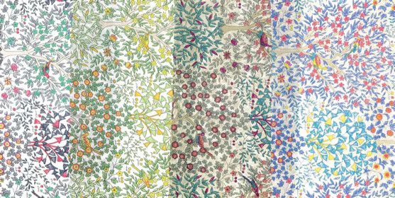 リバティロンドンのスカーフ・デザイン・チームが選んだものに、内部で手を加えた「ジュノズ・ガーデン」は、1940年代にリバティのマートン捺染工場でプリントされたスカーフの柄がもとになっています。