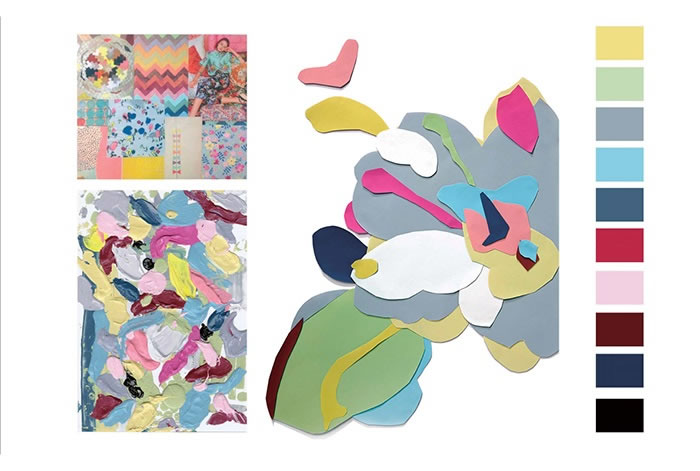 「フレンチ・シック」な抜群のカラーセンスを持つテキスタイル・デザイナーのミーラ・ストレイトのパレットは、パステルカラーにネイビーや、フレンチ・ルージュ、ソフト・グレイと言った色調のコントラストが組み合わせられています。