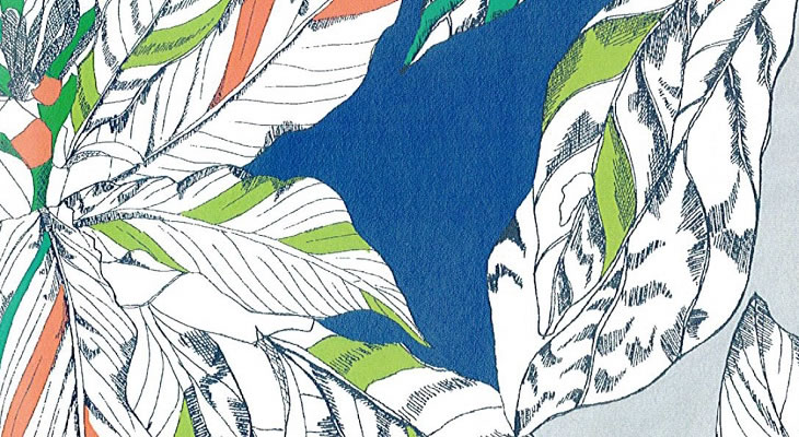 熱帯林の郡葉の観察から生まれた柄で、鬱蒼と茂った葉が作り出す陰影や珍しい植物の生態を、繊細な線遣いとクロスハッチング手法(平行線模様)で捉えています。蔓を這わせる植物や、まだら模様のシダ、つぼみをつけた花々が、森を題材とした一連のプリント柄を作り上げます。