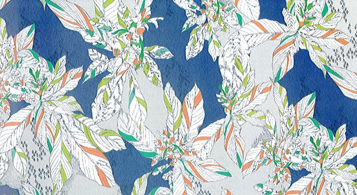 へメロカリス(デイリリー)の観察から生まれた、クロスハッチ(平行線模様)やはっきりとした線使から深みのあるトロピカル柄になっています。