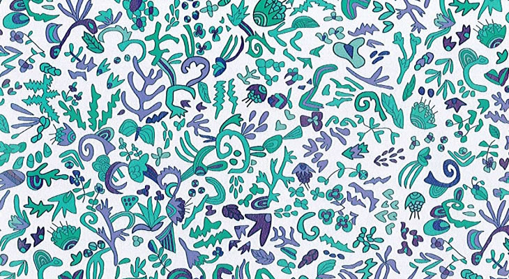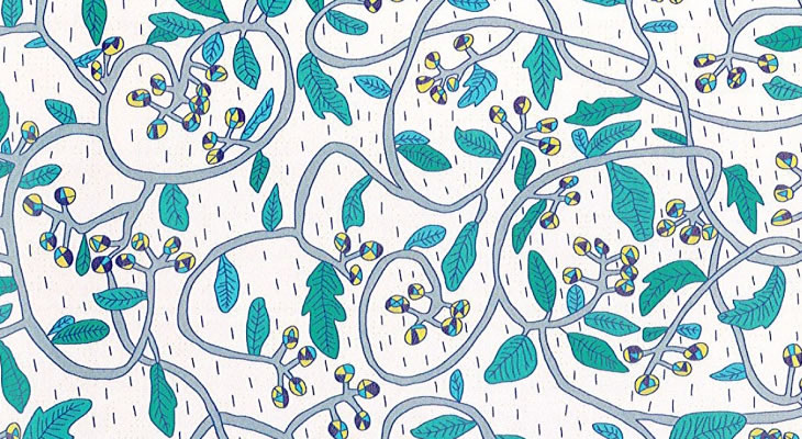 19世紀フランスの素朴派の画家、アンリ・ルソー。彼が描く森林の風景のような、ペンとインクとグワッシュ画法で描かれた子供心あふれる、どこか一風変わった蔦が絡まり合うような柄です。
