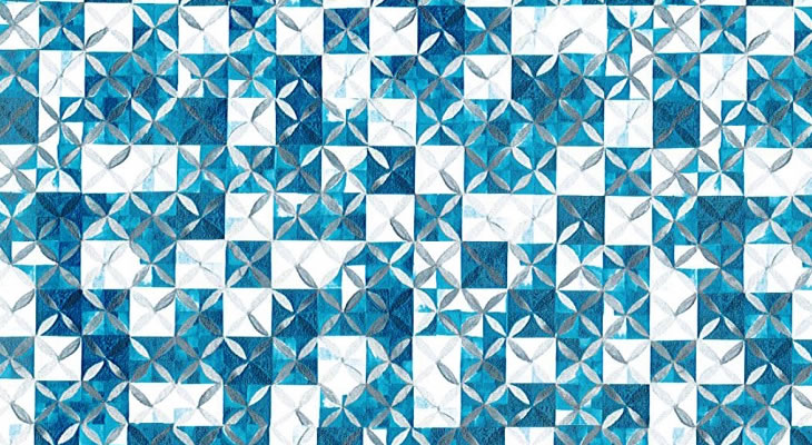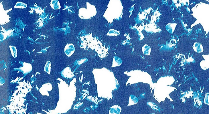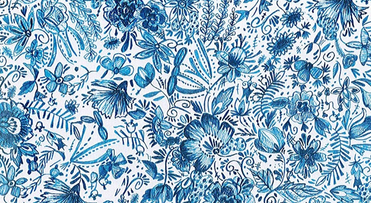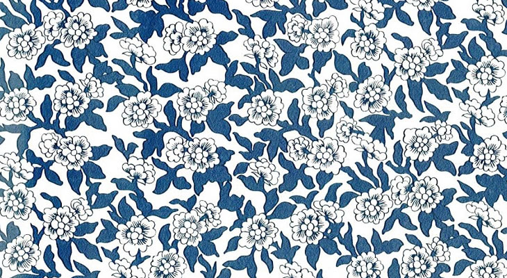 リバティと東洋の歴史的な結びつきを象徴するような、シアンブルーをつくる写真印刷の手法を使ったバティック・スタイルのデザインです。