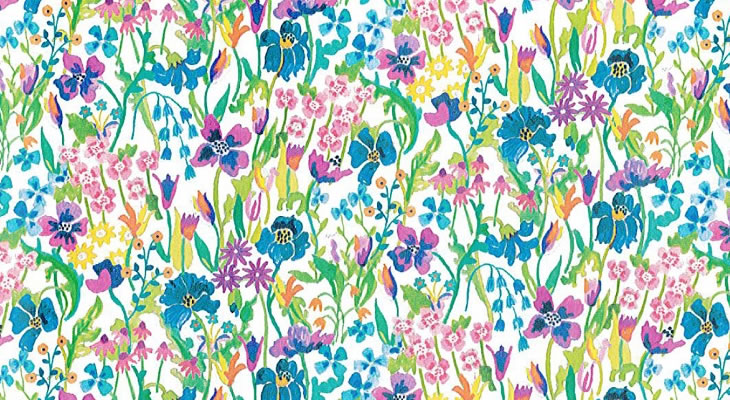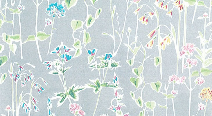 みずみずしく青い草原に鮮やかに咲き誇る花々を描いた伝統的なリバティの花柄に、明るく夏らしいエッセンスを加えました。