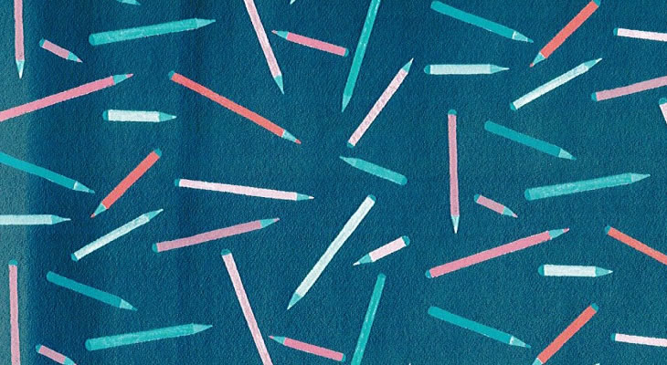 あちこちに散らばる色鉛筆が、カラフルで魅力的なデザインです。