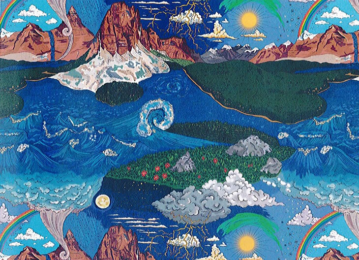ロンドンの街中のグラフティ運動から着想を得たもので、うねる波、雨を降らす雲、七色の虹などの気象騒乱を捉えたものです。エネルギーに満ちた線遣いと質感で気象の世界をプリントで表現しています。