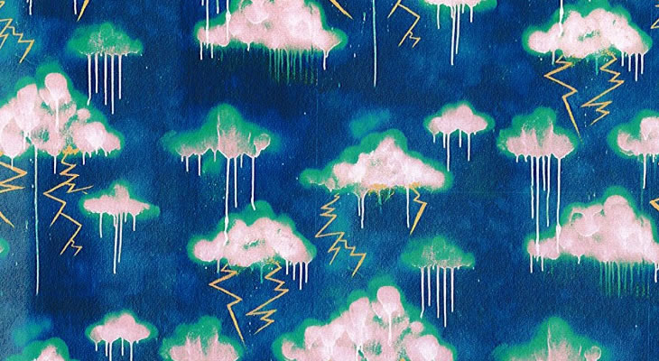 従来のスプレー缶ではなく、塗料の詰まった消火器を使って作品を描く、珍しいスタイルを特徴とするアメリカのグラフティ・アーティスト、KRINKことクレイグ・コステロに影響を受け、嵐のときの雲や雷など不安定な空模様を描きました。