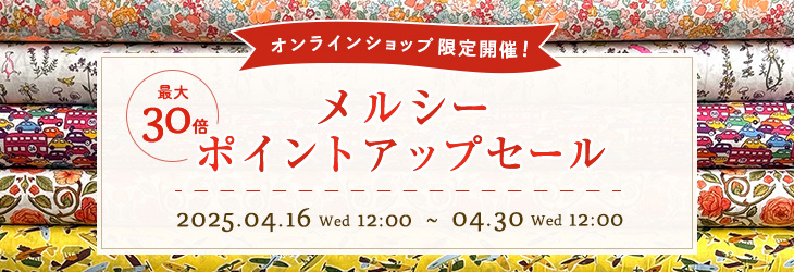 メルシーオンラインショップでのみ開催するポイントアップセール!当店で取り扱う対象の生地をご購入いただくと、なんと最大30倍のポイント還元!