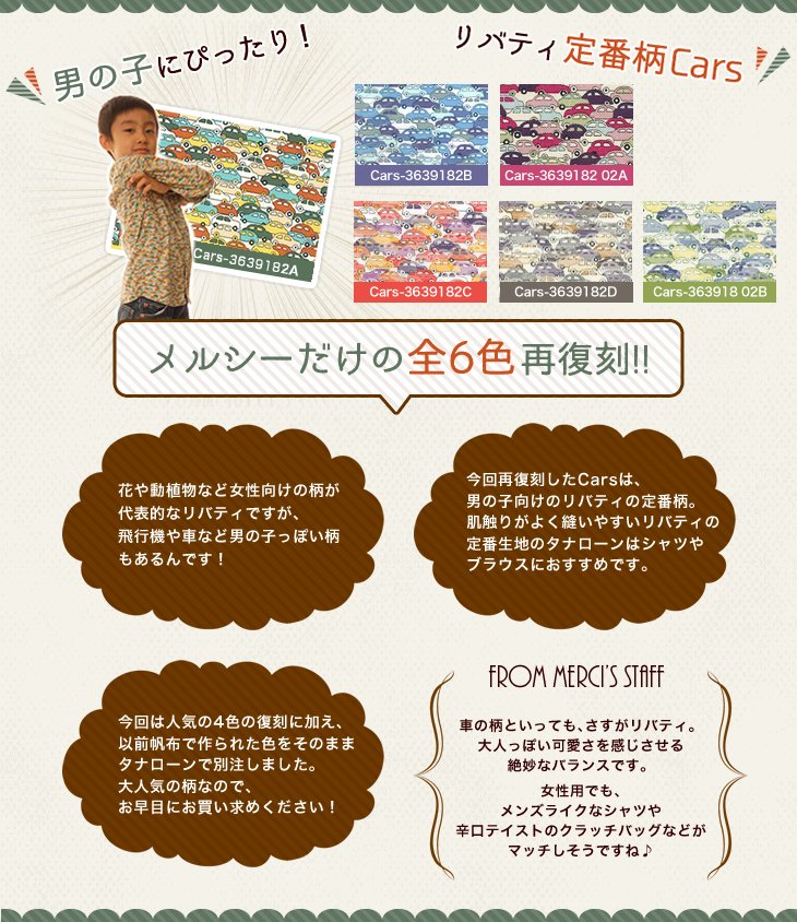 リバティ・ファブリックス、生地の通販メルシー > リバティ・ファブリックス メルシー別注・復刻柄 > メルシー限定復刻 Cars