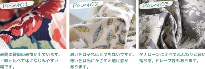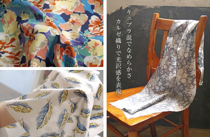今回入荷したキュプラコットンカルゼ生地は、コットンにキュプラを配合して、落ち感やなめらかさを表現した素材。またカルゼという織り方にすることで光沢感を出したアパレル向けの生地です。同じキュプラ配合のリヨセルローンと比べて、透けにくく光沢があります。