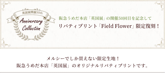 阪急うめだ本店「英国展」の開催50回目を記念して、リバティプリントの限定復刻生地ができました。復刻されたのは「Field Flower」この柄は、第1回英国展開催年の1970年に1970年春夏コレクションとして初めてプリントされ、それ以来1980年代から1990年代にかけて多くのクラシックコレクションに加入していました。とても人気のあるこの小さなボタニカルプリントには、タンポポ、キンポウゲ、ワスレナグサ、ベルフラワーなどの野花が描かれています。メルシーでは今回特別に、こちらの記念生地を当店限定で販売いたします。使いやすい小花柄できちんとした雰囲気のデザイン、お子様から大人までおすすめです。