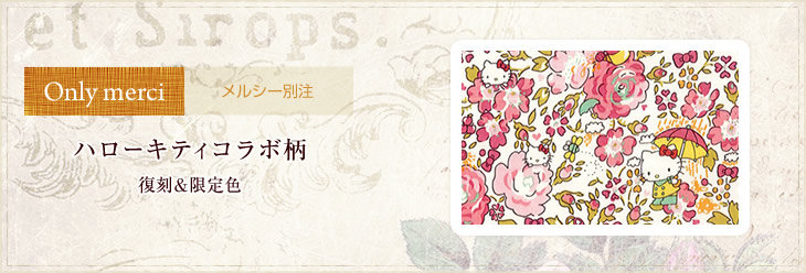 メルシー別注のハローキティコラボ柄をご紹介。2020年10月は大人気で完売してしまった「フェリシテハローキティ」からピンク・淡いピンク・水色地のピンク・ネイビーの4色を再入荷しました。この機会にぜひお買い求めください!