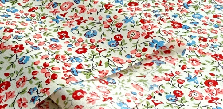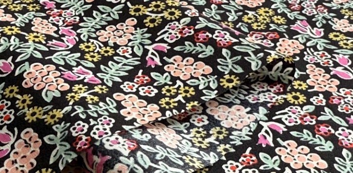 イギリスを代表するテキスタイルスタジオ「シルバースタジオ」によって1944年に生み出され、翌年の1945年にリバティプリントとして登場しました。繊細でスケッチ風のフローラルデザインには、小さなバラやスミレ、デイジー、ベリーが描かれ、ふんわりとした葉や風に舞う小枝と絡み合いながら、陽だまりの草原のロマンチックな雰囲気を表現しています。