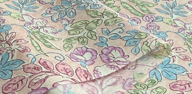 1945年にリバティのマートンプリント工場で初めてプリントされたデザインです。オリジナルの紙に描かれた繊細な質感を忠実に再現するため、リバティのデザインスタジオによって丁寧に描き直されました。やわらかなタッチの花々や優雅に絡むツルの間には、春のエンドウ豆のさやがひっそりと隠れています。