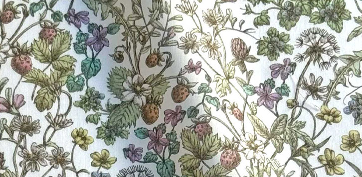 「スプリング・メモリーズ」の花のモチーフの一部を取り入れた、遊び心あふれるコーディネート柄です。花咲く草原に身を委ね、自然の生命力と静かな調和に包まれる、のびやかで心地よいひとときを想起させます。やわらかな鉛筆の濃淡によって繊細に手描きされた構成の中には、豊かな野花の庭が広がり、デイジーやキンポウゲ、クローバー、スミレ、タンポポ、ワスレナグサが咲き誇る風景の中に、熟したストロベリーがさりげなく描き込まれています。