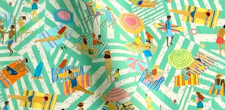 メルシー別注色として展開。リバティのスタジオで手描きされた、遊び心あふれるカンバセーショナル・パターン「ショアライン」。細部まで描き込まれた数々のモチーフが、見る人を物語の中へと誘います。グレイソン・ペリーのセラミック作品に見られる社会的な物語性や、ミクストメディアを自在に取り入れる表現手法から着想を得て、英国の海辺で過ごす夏の、のびやかで気ままな空気感を描き出しています。浜辺では、砂浜でくつろいだり、遊びに興じたり、本を読む人々の姿が点在し、背景に配された大胆なストライプが、現代的なエッジを加えています。幾何学的なコラージュ効果が、全体にさりげない奥行きをもたらしています。