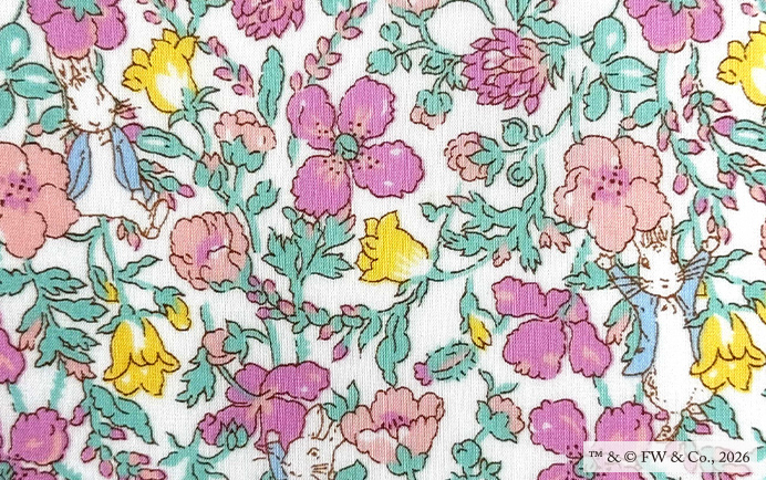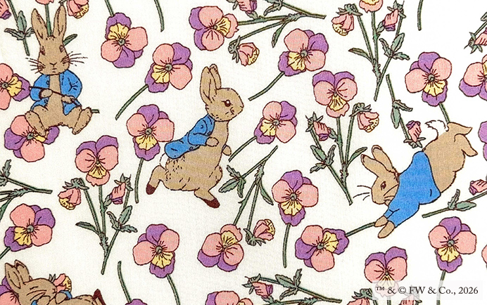 2005年にクラシック・コレクションに加入しているデザインに、私たちも大好きなピーターラビット(TM)のキャラクターが加わりチャーミングに生まれ変わりました!2001年にリバティのスタジオで手描きされた「ロス」には、摘みたてのパンジーの束が転がるように繊細に描かれています。™ &© FW & Co.,2026