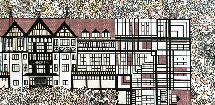 リバティを象徴するロンドンのフラッグシップストアへのオマージュとして描かれた、フローラルモチーフと建築的な幾何学要素を組み合わせたデザインの「チューダー・ベル」。リバティの大きな木製扉をくぐった瞬間の高揚感を表現し、通り沿いには、名高いリバティのフラワーショップに敬意を表して再構築された「マーガレット・アニー」が配されています。