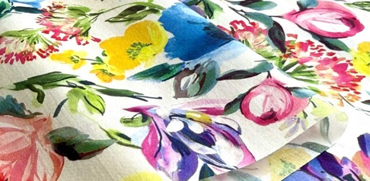 色とりどりの花々が鮮やかに咲き誇り、色彩、質感、そして動きが織りなす美しいハーモニーを奏でます。リバティのスタジオで、さまざまな画材や技法を組み合わせたミクストメディア手法によって描かれた「プロムナード」は、バラ、デイジー、ゼラニウム、キンポウゲ、ポピーが自由に舞い散るようなダイナミックなデザインに仕上げられています。伸びやかに描かれた墨のような筆致は、そよ風に揺れる草原の軽やかな魅力を感じさせ、春爛漫の生命力を見事に表現しています。