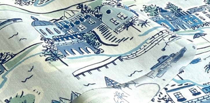 北ウェールズにある美しいイタリア風の村、ポートメイリオンの壮大な景観とパノラマビューからインスピレーションを得てリバティのスタジオで手描きされた「アドベンチャー・コースト」。そこに広がる風景には、デッキチェアやパラソル、ヤシの木、ビーチハット、ボート、趣のある建築など、遊び心あふれる魅力的なディテールが散りばめられています。個性豊かで絵画のように美しいこのプリントは、理想的な海辺のリゾートの魅力が見事に表現されています。