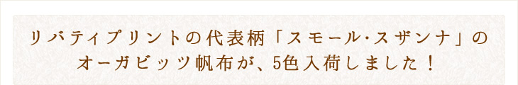 タナローンに始まり、ジャージー、ストレッチチノなど色々な素材で展開されてきたスモール・スザンナ。今回は華やかな色合わせから同系色まで、エターナル柄の5色をオーガビッツ帆布でメルシー限定で別注いたしました。