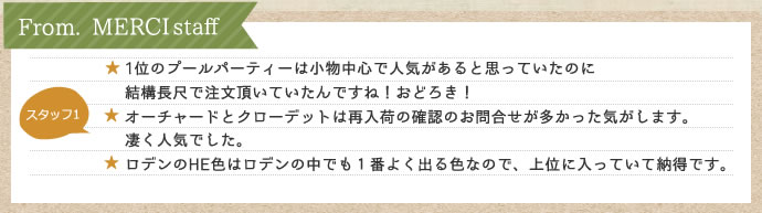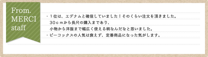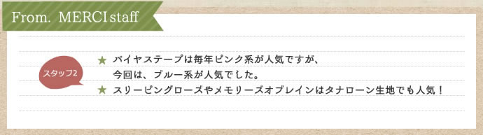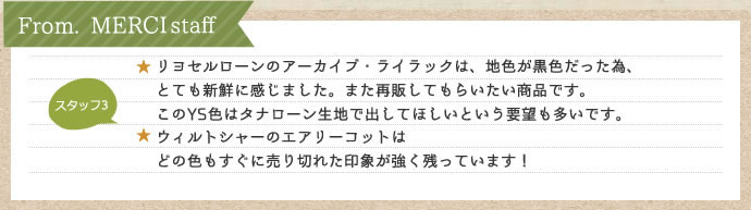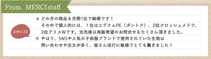 今年も子供服ブランドで採用された生地が1位・2位となりました!ピーコック・オブ・グランサムホールは2016年に引き続き人気です。また2017年より販売開始となったアーカイブ・ライラックのリヨセルローン生地が健闘しています。