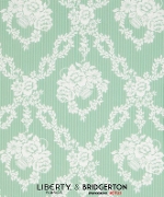 1920年代のリバティのパターンブックから発見されたシルクの断片からデザインされた「ガーランド・ハンパーズ」は、18世紀から19世紀にかけて伝統的にプリントされたダマスク柄の壁紙や椅子張り生地のエッセンスを取り入れています。斜めに描かれた葉のリースに囲まれた複雑な花のハンパー・バスケットが繊細なストライプを背景に配され、古典的なエレガンスと現代的な繊細さの時代を超えた融合を感じさせます。