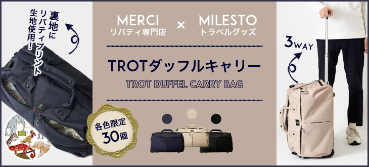 ダッフルバッグ・ショルダーバッグ・キャリーケースの3way仕様!ショートトラベルに便利なMILESTOさんのTROTダッフルキャリーとリバティがコラボしました!各色30個ずつのメルシーオリジナル商品です。