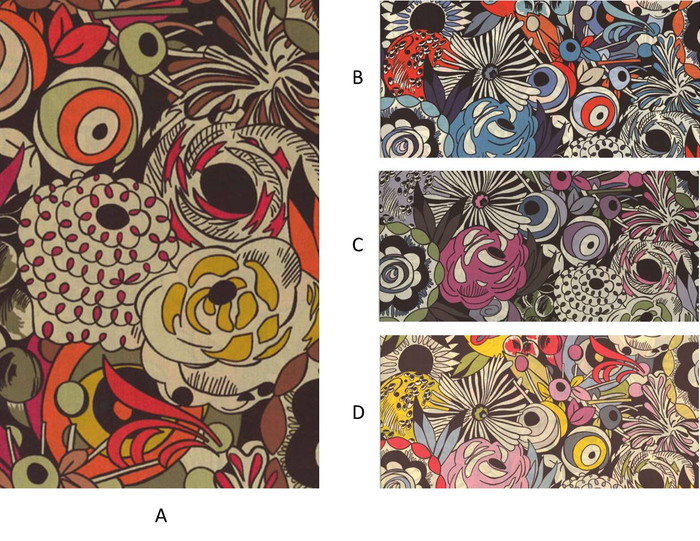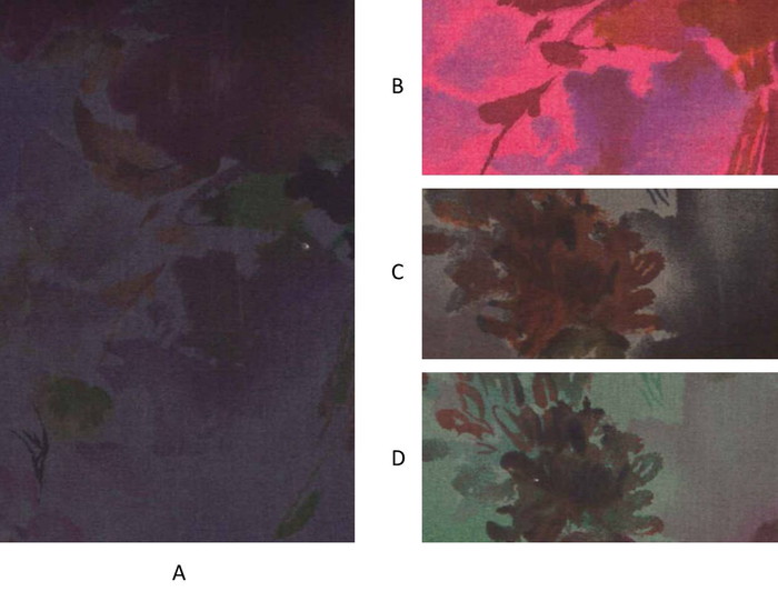 デジタル・プリント向きの柄をスクリーン・プリントで表現したもので、樫の木の葉の写真と層になった葉の写真を組み合わせて柄にしています。色の重なり具合によって、異なる色の効果を生み出します。