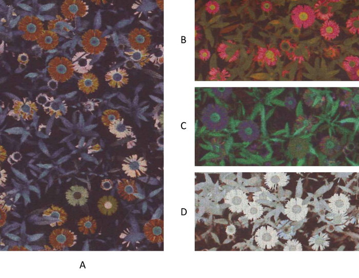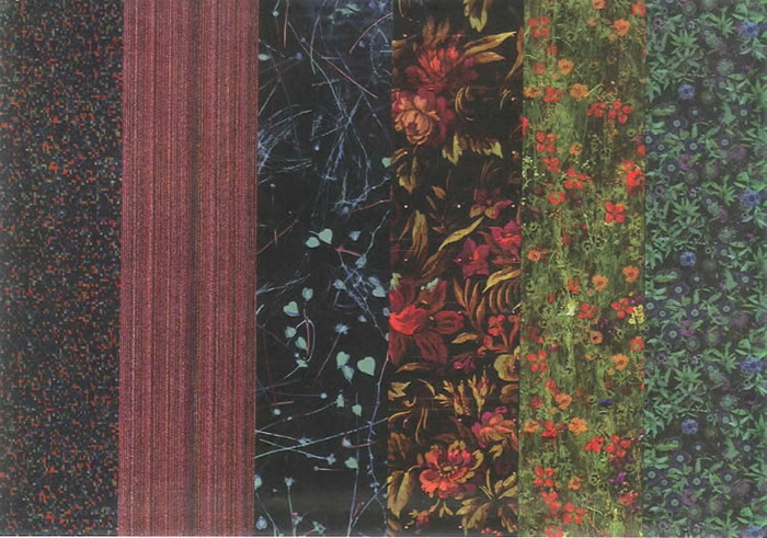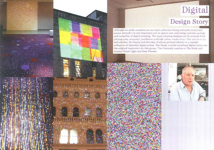 今回のコレクションの中心は、リバティが誇るロータリーやスクリーン・プリントですが、その一方で、環境や多様性に優れたデジタル・プリントなどの新技術にも目を向けることが重要です。写真、コンピュータ・ピクセレーション、ハイカラーなどを使うことで驚くような柄を作り出せるようになりました。スクリーンを使ったリバティ・プリントの美しさと多様性に匹敵するデジタル・プリントを目指し、ミニ・コレクションを作りました。このグループにインスピレーションを与えたのは、世界的に有名なデジタル・アーティストのティム・ヘッドでした。ティムは現在『ザ・スレード美術学校』で教鞭をとっています。バーチャル・ライトとダスト・フラワーズを制作しました。