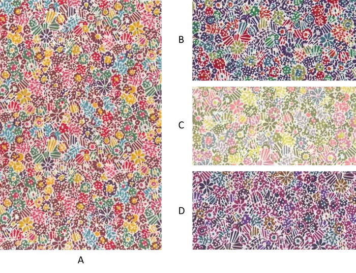 幾何学的模様で、様式化された花を散らしたヴィンテージ柄です。地型が使われ、花びらはベタな色になっています。リバティのアーカイブで見つけた日付不明の図柄をもとにしています。