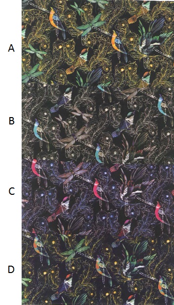 モーは昔から子どもの童話やそこにでてくる邪悪な魔法に魅了されてきたことから、リバティの象徴であるピーコックを色々な種類の鳥で表現しようと考えました。彼は1920年代のリバティ・アーカイヴのプリントからヒントをとり、鳥には真珠の首飾りやアール・デコのブローチを飾り、周囲にはトンボをあしらい、深みのある色地にシュールレアリズム的な柄を生み出しました。