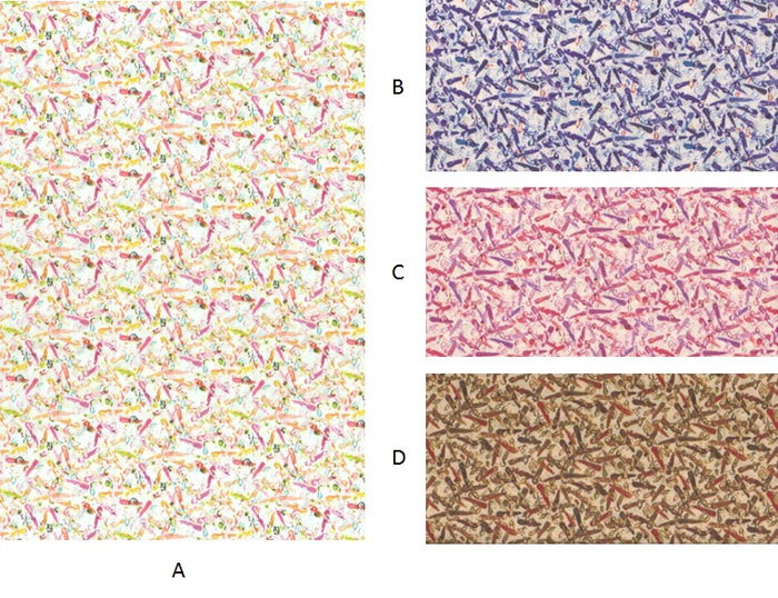ジェイミーらのチームが制作した虹色のレインボー・サラダのレシピでデジタル・プリントされた柄です。押しつぶされたニンジンやカブの柄を縮小し、ざっくりとしたツィードのような効果を出しています。