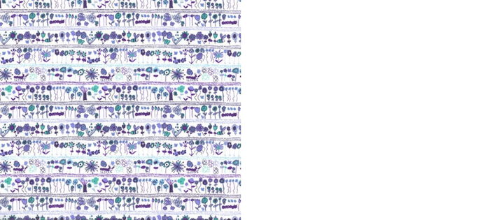 トレスコ島に分布する素晴らしい植物をヒントに、クラスの様々な年齢の子供たちが描いた花柄のコレクションです。強い日差しが照りつける熱帯というより、ハワイアン・プリントに近い色彩になりました。