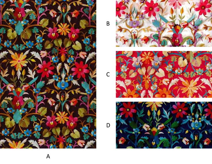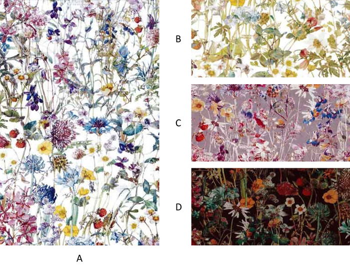 この柄はスー・ブラックウェルが19世紀初期の『英国野花図鑑』の中で見つけたあるイラストを切り抜いたことから生まれたものです。