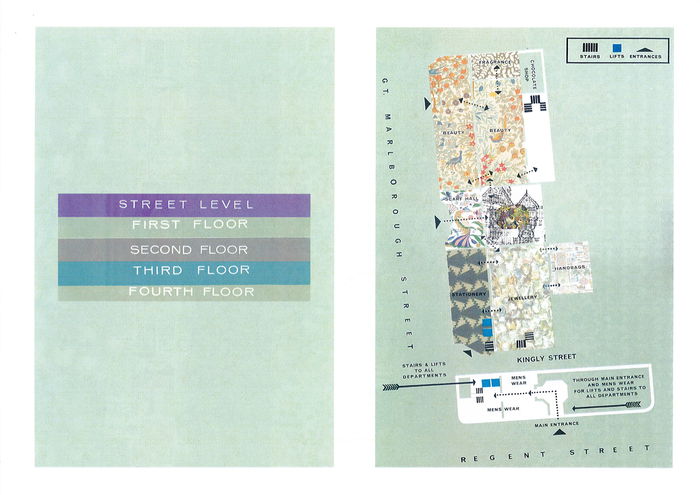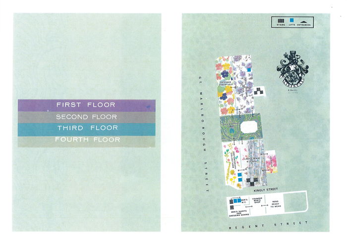 1930年代のリバティ初期のスクリーン・プリントをもとに制作されたシンプルで様式化された柄に、リバティ内で手を加えました。このフロアで売られているデザイナーに欠かせない必需品(エッセンシャルズ)を表しています。