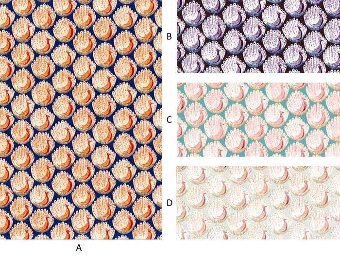 18世紀に飾り気のない無地のコットン・キャラコは多くの人々に洗濯の利く耐久性に優れた素材として広まりました。この柄は折り畳んだキャラコをもとに描かれています。畳んだメタルやフォイルをグワッシュで色付けすることで、18世紀の経済や社会の変化に大きな役割を果たしたこの素材の質感と丈夫さを表しています。